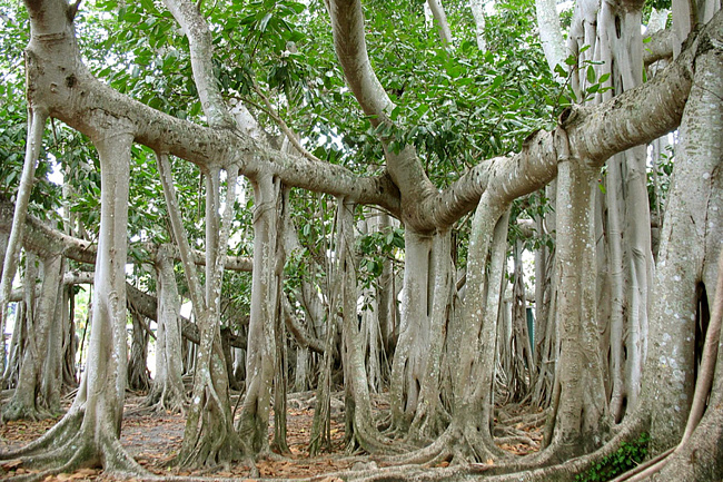 Титул самого раскидистого дерева принадлежит баньяну (фикусу бенгальскому). Родина этих деревьев – Индия. Особенностью баньяна является то, что сначала растет одно дерево, после из его ветвей вытягиваются отростки-корни, тянущиеся к земле.