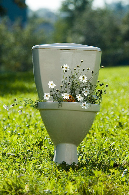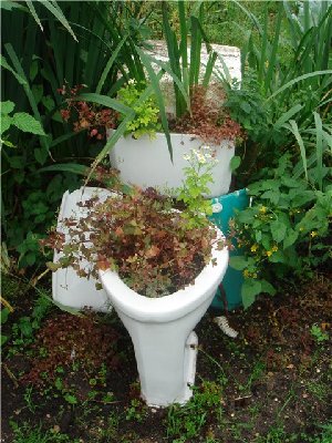 Прекрасное решение для создания оригинального дизайна на садовом или дачном участке, или даже изменение стандартного вида клумб на улицах города. Необычно – раз, экономно (не нужно тратить деньги на приобретение качественных садовых цветочных горшков) – два. Так что подумайте, перед тем как выбрасывать старый унитаз. Возможно, он еще прослужит не один десяток лет?