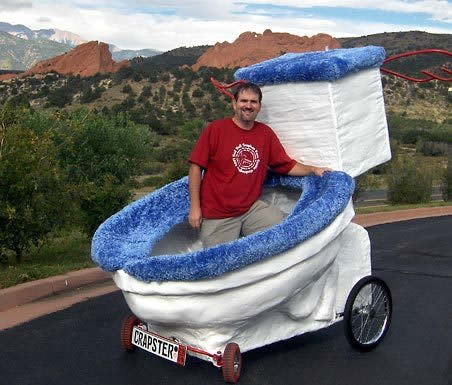 Но, кроме таких машинок для развлечений, унитаз для американца Тома Валентина послужил прототипом для самодельной гоночной машины. Автомобиль в виде унитаза был сооружен для конкурса, который регулярно проводит компания Red Bull. Он участвовал в гонках и даже занял 2 место.