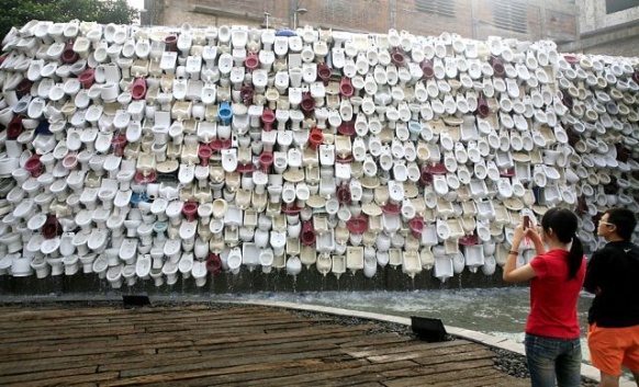 Унитаз и вода – неразделимы (конечно, если в эту связь не вмешиваются коммунальщики и нерадивые сантехники). Этим и воспользовались китайские мастера, соорудив стометровую стену из унитазов, кое-где разбавляя их для оригинальности другими сантехническими «приборами». Когда эта «унитазная стена» была готова, включили воду, и окружающие и любопытствующие увидели незабываемый фонтан-водопад.