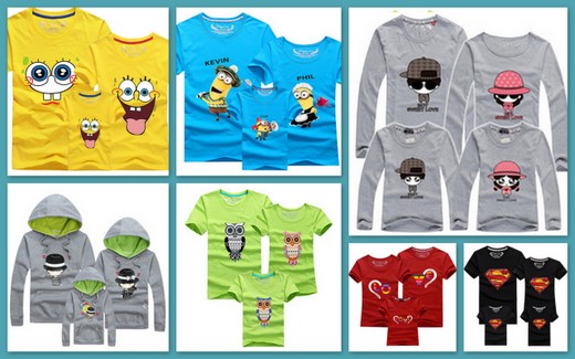 3. Принты и надписи как вариант Family Look. Данное направление в одежде можно поддержать, купив детали гардероба с одинаковыми рисунками, принтами или надписями (которые или дублируются на одежде, или дополняют одну другую).