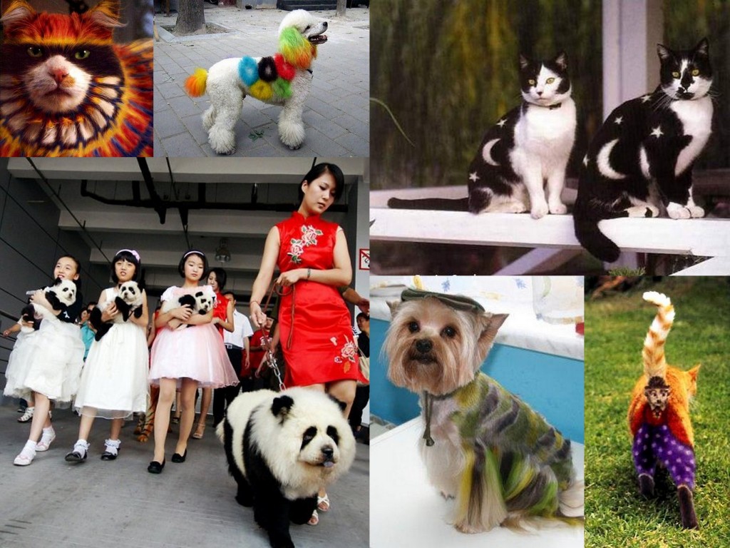 А не так давно хозяева собак и котов начали делать зверькам не просто прически, а красить и стричь их шерсть под других зверей. Все чаще на улице можно увидеть котов в виде зебр, собак в образе тигров и др. Даже целое направление в альтернативном искусстве возникло – боди-арт для животных.