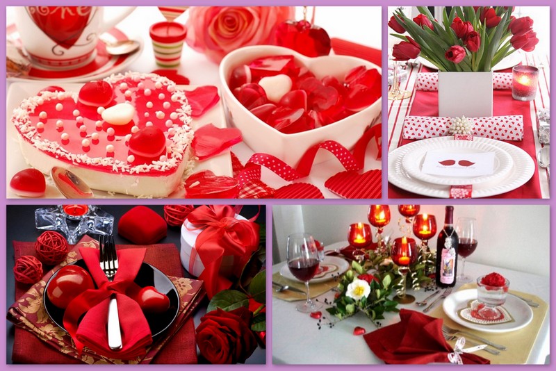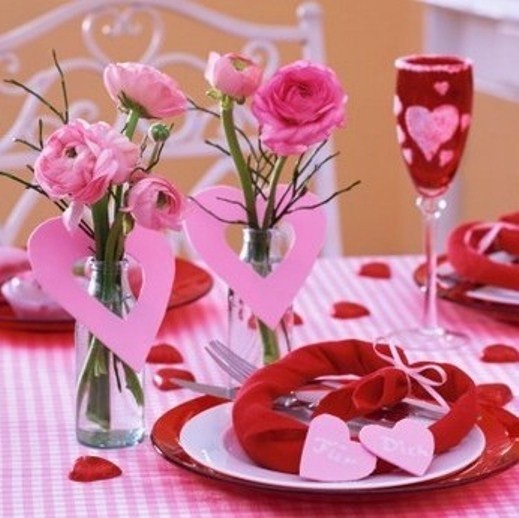 Это может быть новая яркая скатерть с салфетками в тон, высокие свечи (как уж без них в День влюбленных?), рассыпанные по столу мелкие бумажные «валентинки». Очень красиво будет смотреться белоснежная скатерть с лепестками живых красных роз. А свечи могут быть и небольшими, но в огромном количестве – на столе, на полу, на мебели (но стоит быть внимательными!)