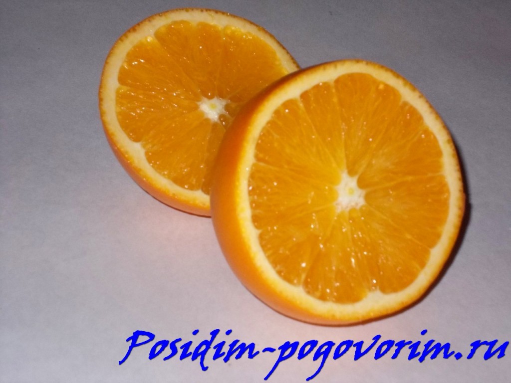 1. Разрезаем апельсин на две части произвольно. Можно на равные, можно на разные.