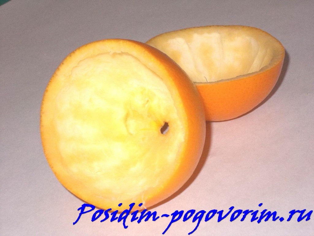 2. С помощью ножа, ложки, пальцев и прочих приспособлений (кто как умеет и желает) очищаем апельсин от мякоти.