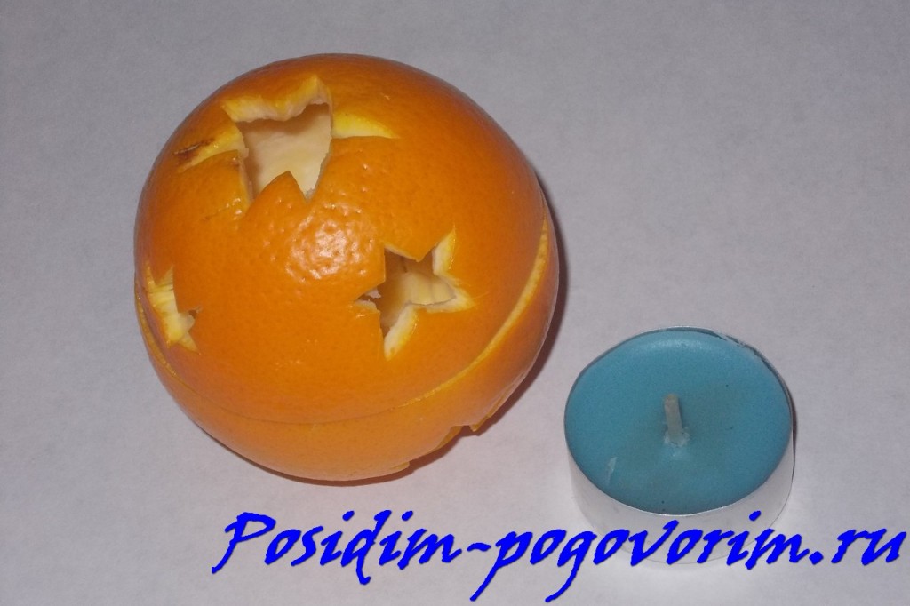 Первый вариант свечки уж очень напомнил Хэллоуин, но добрый. А вообще идеи стоит попробовать воплотить в жизнь. Дешево и сердито, как говорится. А уж апельсины, я думаю, в каждом доме найдутся.