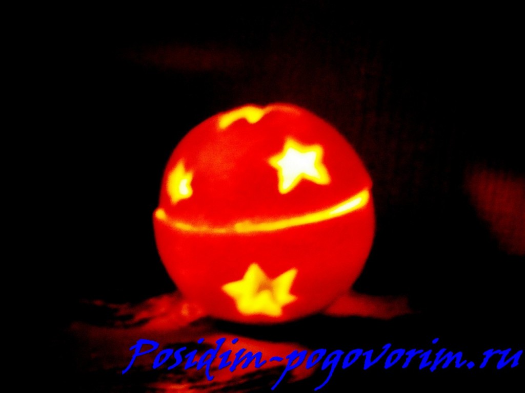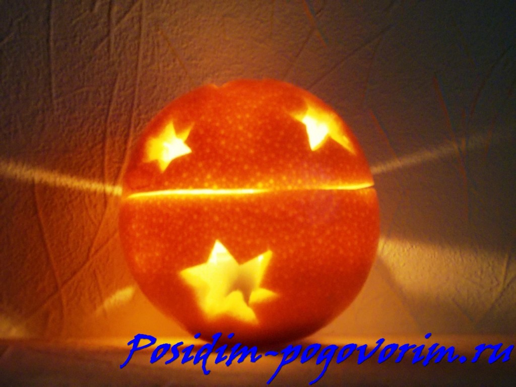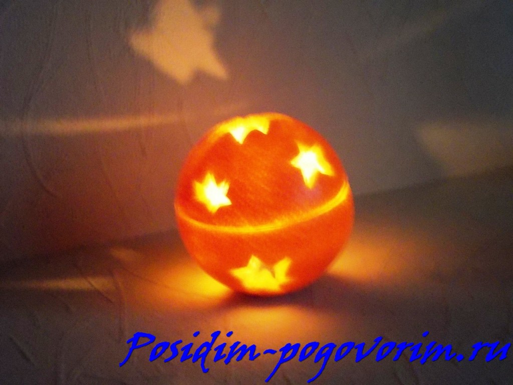 Наш апельсиновый подсвечник готов. Осталось только поставит внутрь нижней части свечу, зажечь ее, накрыть второй половинкой. Красиво? А если выключить свет?