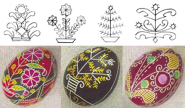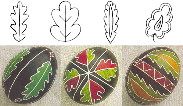 На писанках зустрічаються і символічні, схематичні зображення дерев, листя.