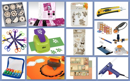 - инструменты – ножницы (с ровным лезвием и фигурным), фигурные дыроколы, штампы (резиновые, силиконовые; на деревянной основе и без нее), доски для тиснения, линейка, канцелярский нож, карандаш, степлер, иголка, нитки;