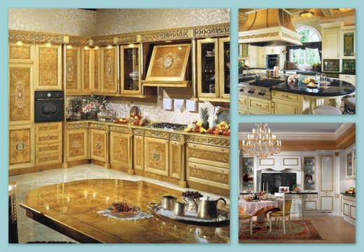 Массивный деревянный стол на резных ножках и мягкие стулья с высокими спинками и подлокотниками, обтянутые кожей или кожзаменителем дополняют образ. Отделка стен выполняется с применением венецианской штукатурки или дорогой керамической плитки. На полу используется мраморная плитка. Главное украшение кухни – люстра на светлом потолке, которая сверкает блеском хрусталя.