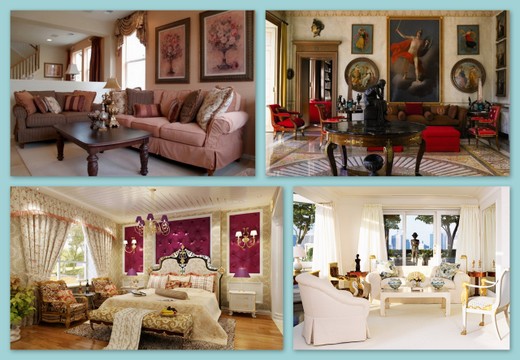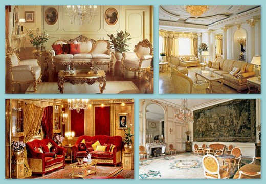 – использование в декоре картин и зеркал в позолоченных рамах, фресок, лепнины, формы лап и голов животных и птиц в оформлении дверных ручек и мебели.