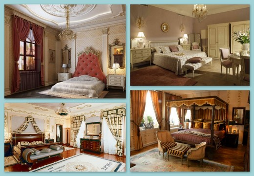 – наличие драпировок, балдахинов, штор из дорогих, тяжелых набивных тканей (шелк, парча, бархат и т.п.);