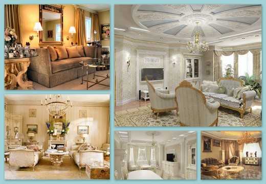 Стены могут быть украшены барельефами, зеркалами и картинами в золоченых рамах.