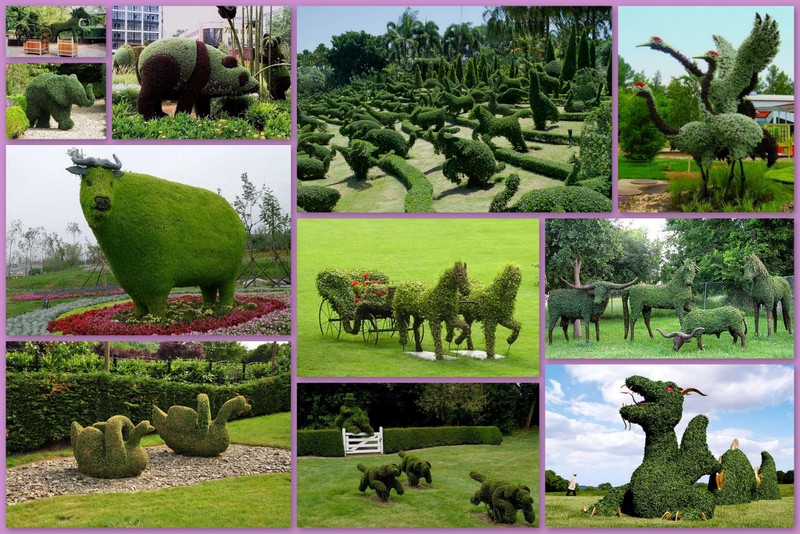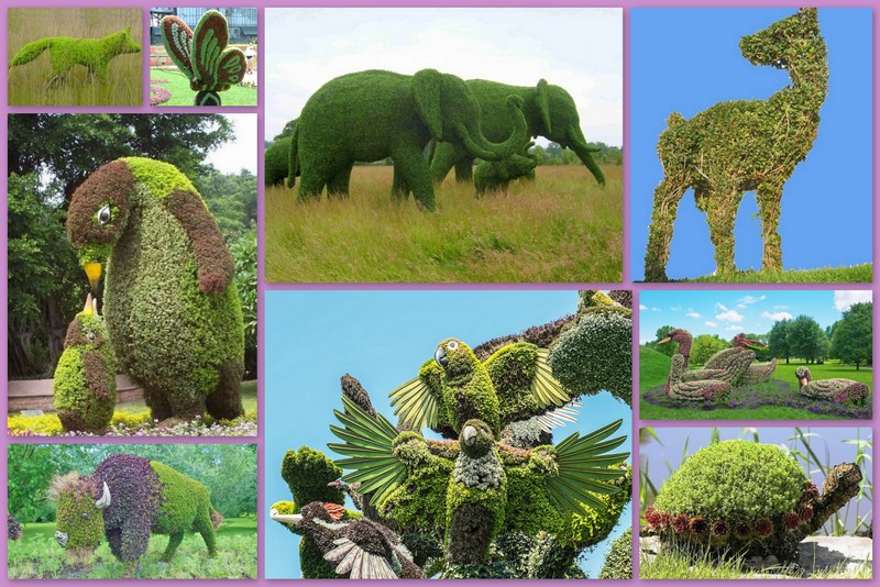 Достаточно популярны растительные фигуры животных. Здесь используется не только декоративная стрижка вечнозеленых кустарников, но и выполняется работа с проволочным каркасом, используются травянистые растения, цветы, суккуленты для лучшего эффекта и придания необходимых форм и даже оттенков композиции.