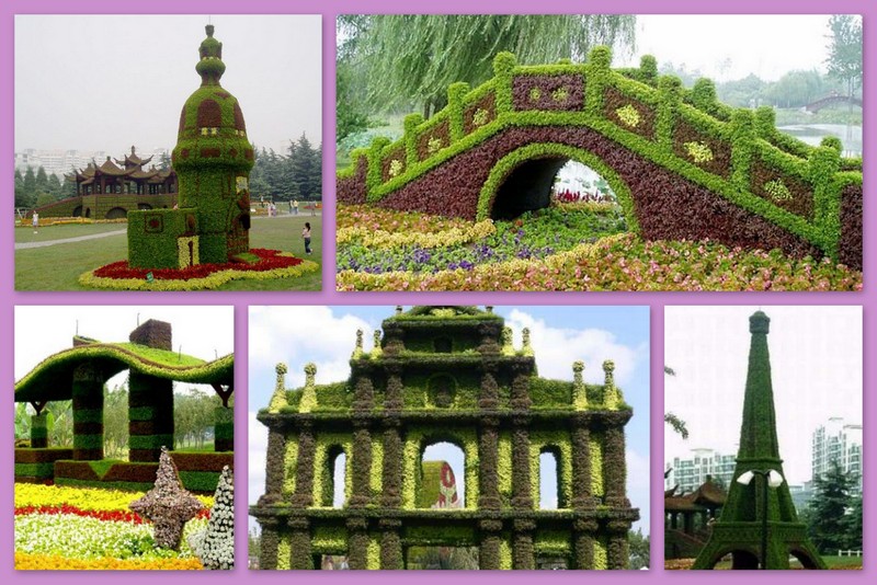 Очень эффектно выглядят известные мировые строения, реализованные посредством топиари,  или просто мостики, храмы, церкви, мини-дворцы.