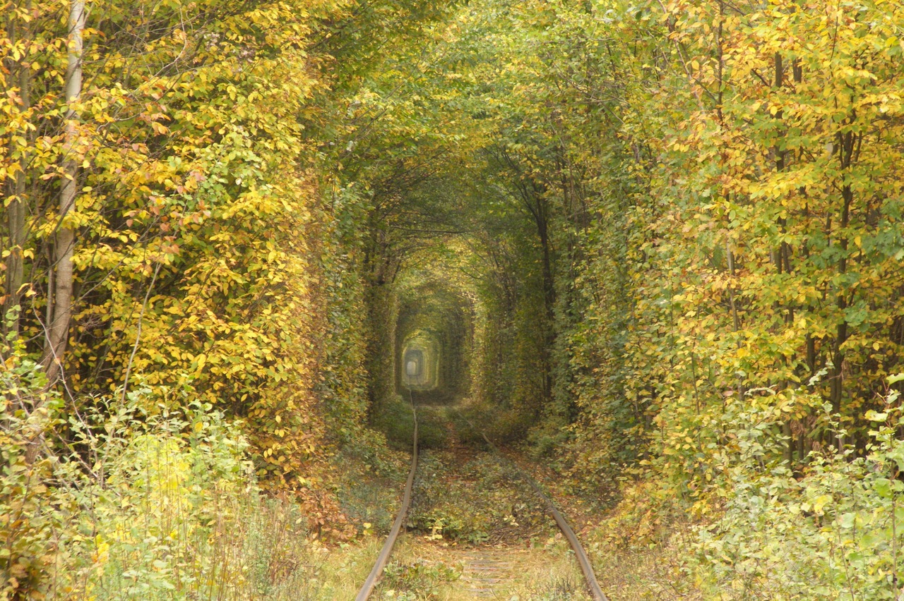 В теплые осенние деньки тоннель становится золотым, от солнечного света и желтеющих листьев.