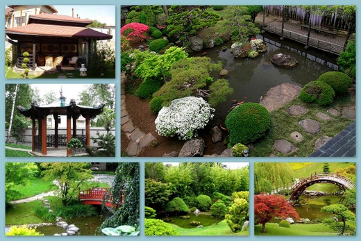 Территория: обязательный японский сад с беседками, водоемами, декоративными камнями. Растения: вечнозеленые, со свисающими ветвями, цветущие деревья и кустарники (сакура, вишня, яблоня, боярышник), цветы: камелия, пионы, ирисы.