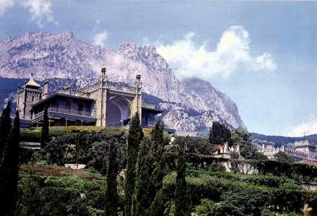 Очертания горы Ай-Петри, то покрытой дымчатой поволокой, то ослепительно белой от лежащего снега в лучах зимнего солнца, дополняют недосказанную архитектором мысль. Глыбы необработанного камня, стройные кипарисы и душистые сосны в парковом окружении создают естественный и гармоничный ландшафт с уникальным дворцом.