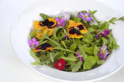 Анютины глазки, фиалка душистая. Цветы используют для придания тонкого вкуса овощным и фруктовым салатам. Подают и к десерту.
