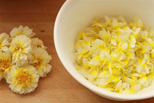 Хризантема. Ароматные лепестки добавляют к салатам, супам. Некоторые рецепты предлагают цветки хризантемы отварить. Уникальный по вкусовым качествам и полезности салат с фруктами и медом, приправленный лепестками роз и хризантем.